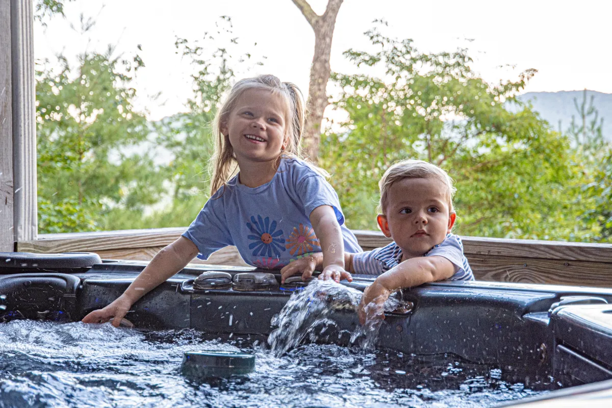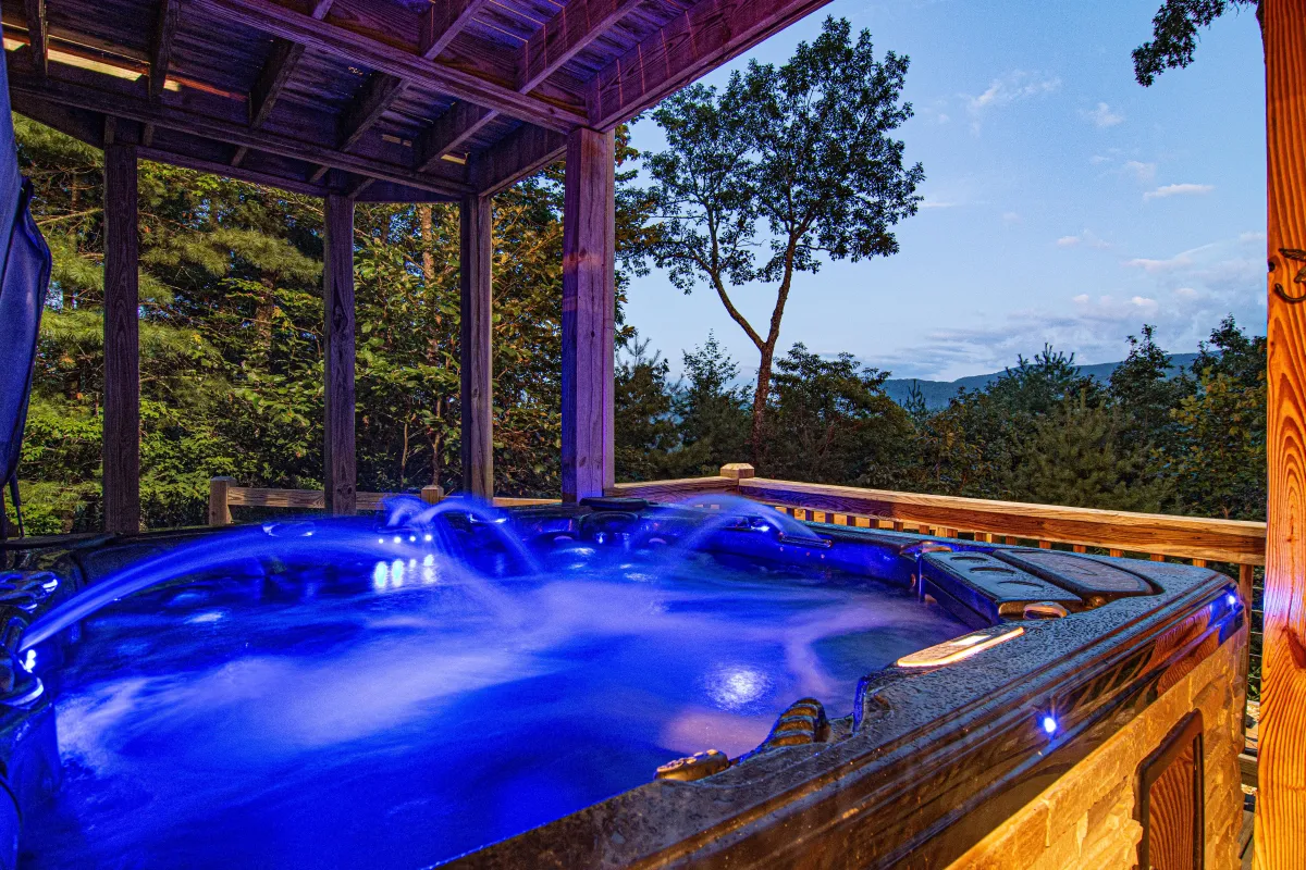 Six-person jacuzzi overlooking the Blue Ridge Mountains with built-in TV and speakers